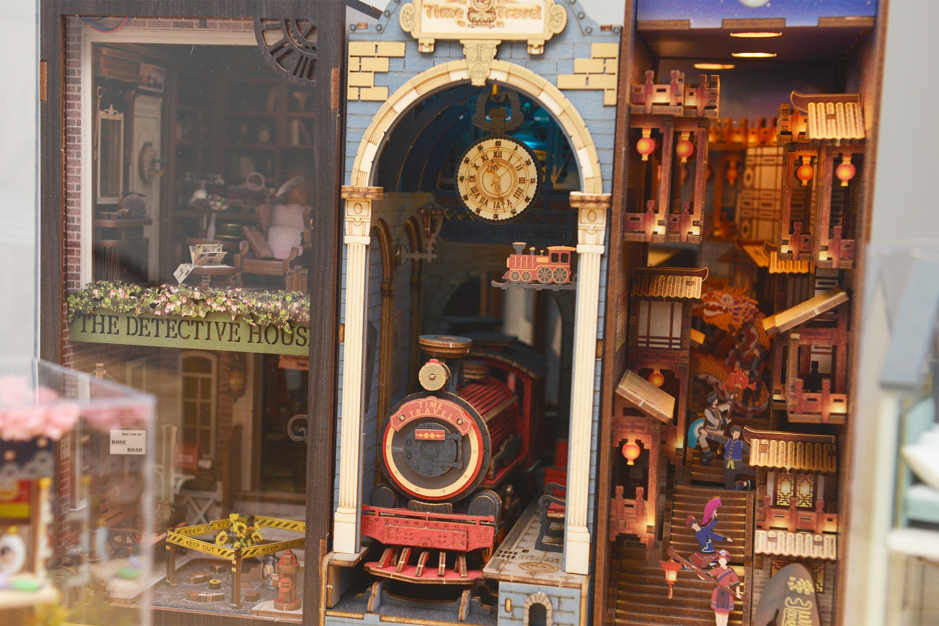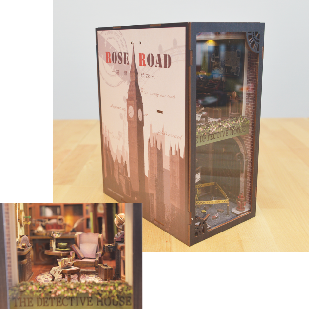 ミニチュアサイズのインテリア雑貨や壁紙など、細部まで計算されて作られているので、アクリル板を通してそのままの世界観をお楽しみください。